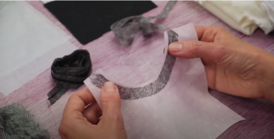 Дублерин на тканой основе, есть кромка и легко определить направление долевой нити. Направление долевой нити совпадает с направлением на дублируемой детали. У флизелина тоже есть подобие долевой нити. В том направлении где он труднее рвётся и есть подобии долевой нити. Соответственно совмещаем это направление с долевой нитью на детали.